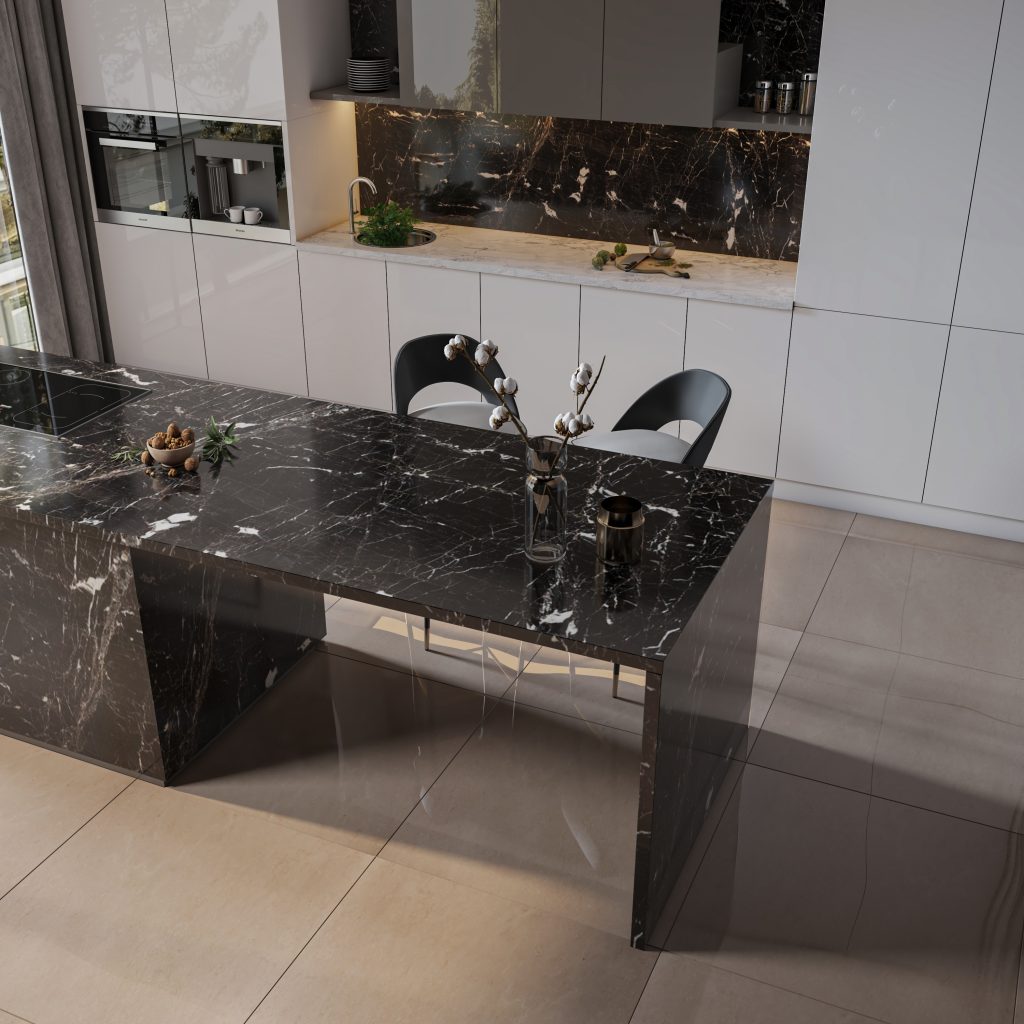 The 3D Black Marble is one of the prominent and popular stones in interior design. With its deep black color and prominent veins, this stone adds a very luxurious and modern look to any space. Its use in areas such as interior facades, flooring, walls, and even stairs creates a striking and unique appearance. Exceptional polishability, high compressive strength, low water absorption, along with its black background and golden veins, are the unique features of this stone.