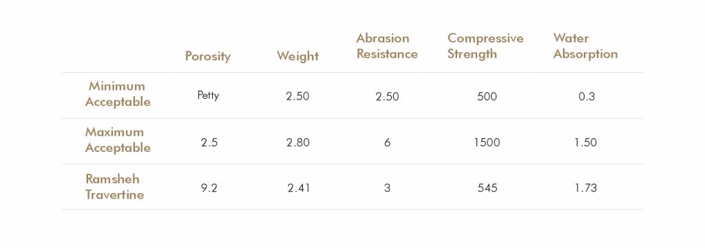 Ramsheh Travertine, with its warm background and soft beige to cream tones accented by fine horizontal dark natural veining, is recognized as one of the textured and visually appealing travertine stones. With balanced porosity and good adhesion properties, it performs well in both exterior facades and interior design applications. Its high compressive strength and abrasion resistance make it a reliable choice for high-traffic and weather-exposed areas. Additionally, its low water absorption rate enhances its overall durability. Combining natural beauty with structural performance, Ramsheh Travertine is an ideal option for facades, flooring, and decorative elements.